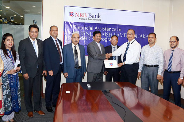 Mr. Md. Khurshed Alam, DMD and Head of Sustainable Finance Committee of NRB Bank Ltd. is handing over a cheque amounting BDT100,000/-(Taka One Lac Only) to the representatives of 'Wrangler Kiron Dey Model College' Mymensingh on November 13, 2019 at the Corporate Head Office for the construction of Academic Building as a part of the CSR activity of the Bank. Mr. Mamoon Mahmood Shah, AMD, Mr. Mohammed Shaukat Ali, Head of SFU, Mr. Muhammad Shafiqur Rahman, Acting Head of CAD, MS Tania Chowdhury, FAVP CAD were present in the program.